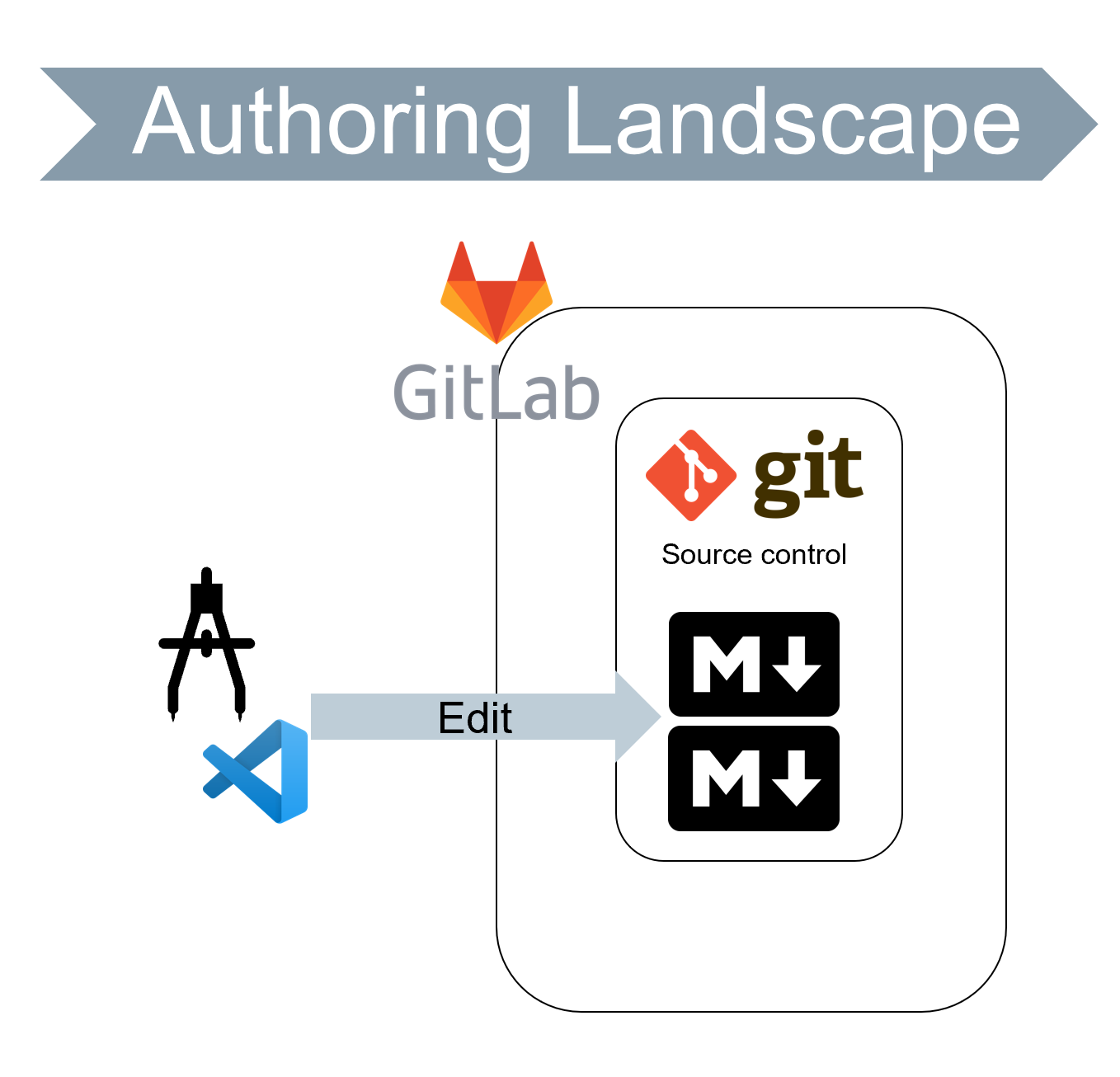 Based on those thoughts, the concept of content as code was quite promising. Indeed the same rules should apply for the documentation as for the code. If the architecture is from developers for developers, why not use the same tool landscape (e.g., Git, vscode, or any IDE). Architecture is a living object like code, and it is also a critical asset we can apply the same processes (e.g., Quality gates within a CI, Merge Request…). Architecture and code always diverge over time; maybe putting them together might reduce the risk. We ended with a classical developer tool landscape for the authoring part: Gitlab or any other source control system, markdown for the content, and Git for versioning.